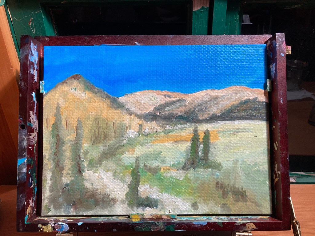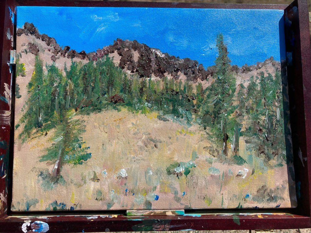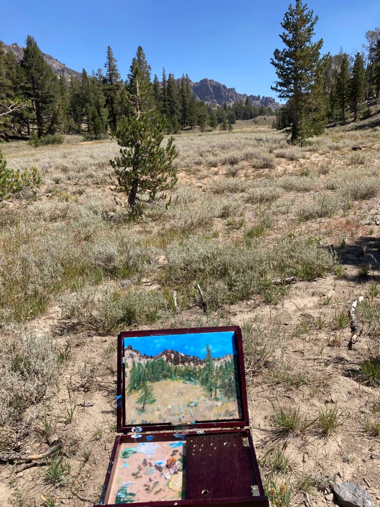 The top of Sonora pass/Highway 108 reaches 9,600 before you quickly descend into the eastern side. Near the top are meadows of wildflowers and dark volcanic rock and scattered trees.