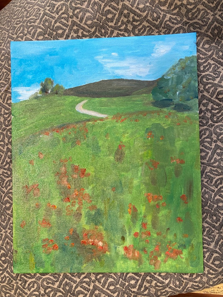 For the painting below, I was painting from a photo of the lush green grass the show of poppies that occur in April every year.