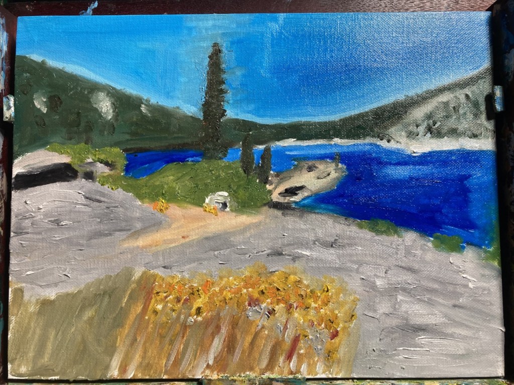 These scene is a view from the east side of the lake looking West back toward the beach. It’s later summer with some beach showing and some yellow almost dried flowers in the large granite slopes on the eastern side of the lake.