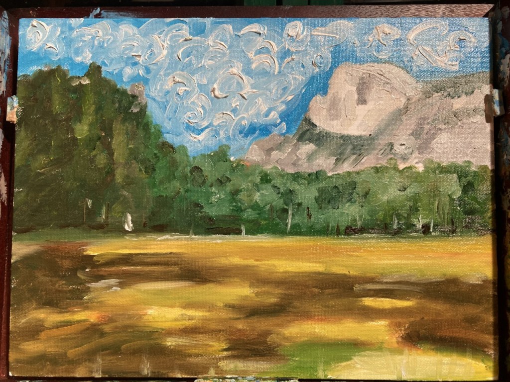 The colors of the Valley floor change from the browns and grays of winter to the greens of spring to the yellows and oranges of late summer. This painting is based on an August valley trip while climbing half dome and exploring the valley.