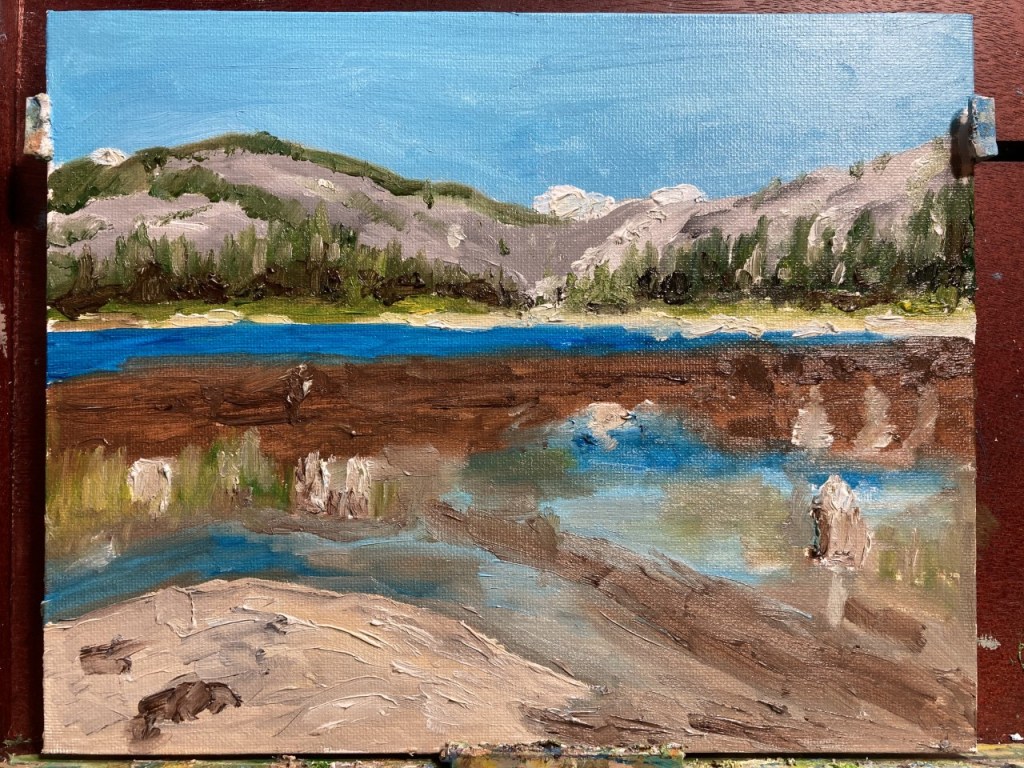 This is a view looking east with the granite mountains reflecting into the still lake. It is always clear but on the cool side for swimming. It is about 7500 feet elevation and can have snow in the area around well until into June.