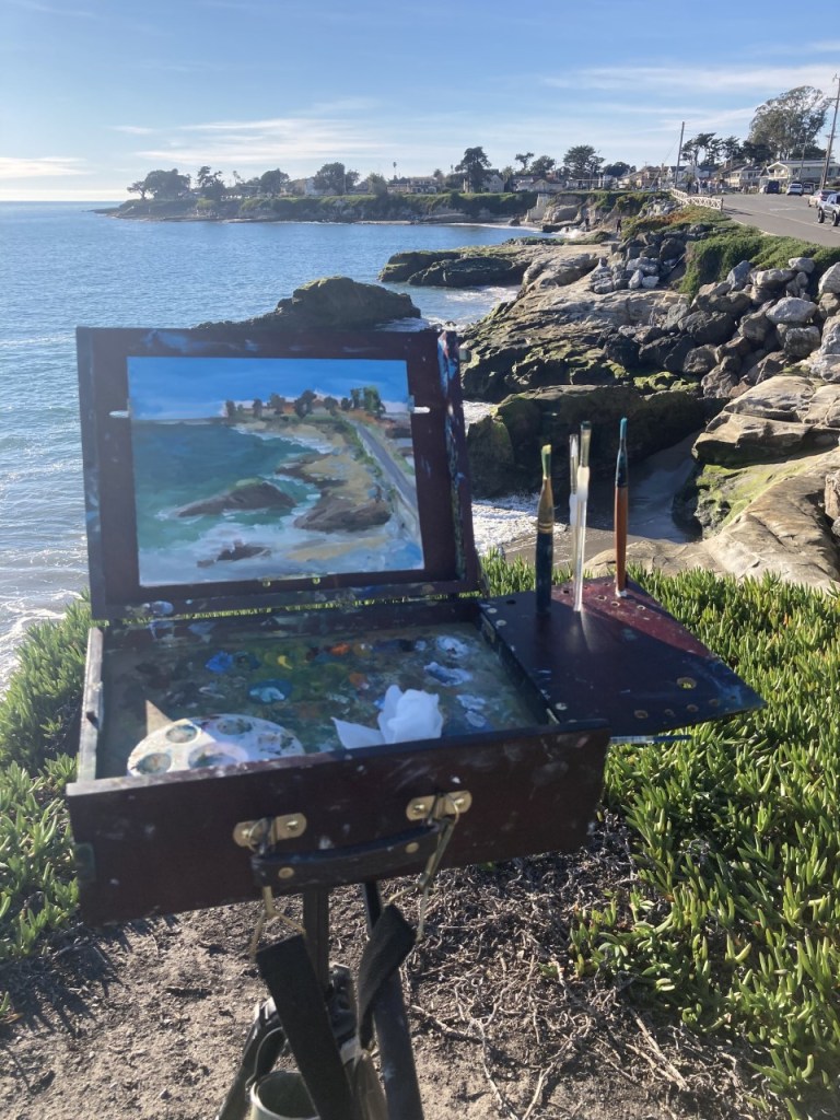 California “winter” is often 68, sunny and calm! Today when painting on the coast in northern Santa Cruz, the weather was just that and everyone was out to enjoy it.