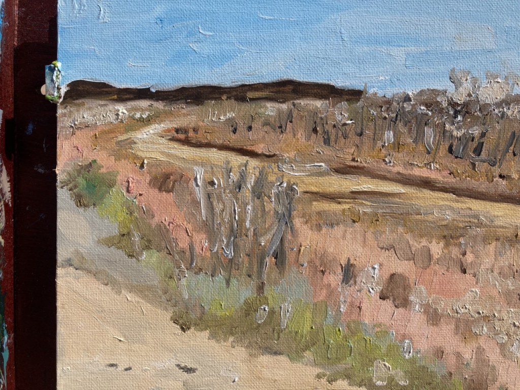 On a Southwest road trip this spring, we camped above the Rio Grande River one night. We arrived to late to paint the river and mountain behind it that night, but the next morning I was able to paint mostly the winding river the dark mountains in the distance.