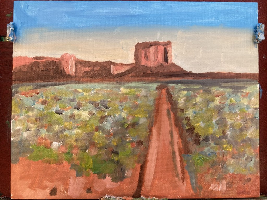 In April we camped just outside of the Monument Valley entrance at a remote campsite offered with a place called Rent-a-tent. The views in the evening and the morning were stunning. This view is a late evening view with the sun low and setting in the west. This view is looking south some some parts of the mountains bright while others area in shade. The sky was changing from blue to light blue and brown as we walked down this road.