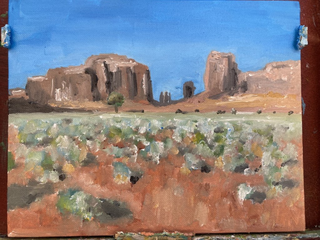 In April 2022, we drove to Monument Valley and entered the park and drove the 15 miles interior loop. This is one of the views with the tiny 3 pointed monument in the far distance. The sun was high but cast some nice shadows on the few sparse plants.