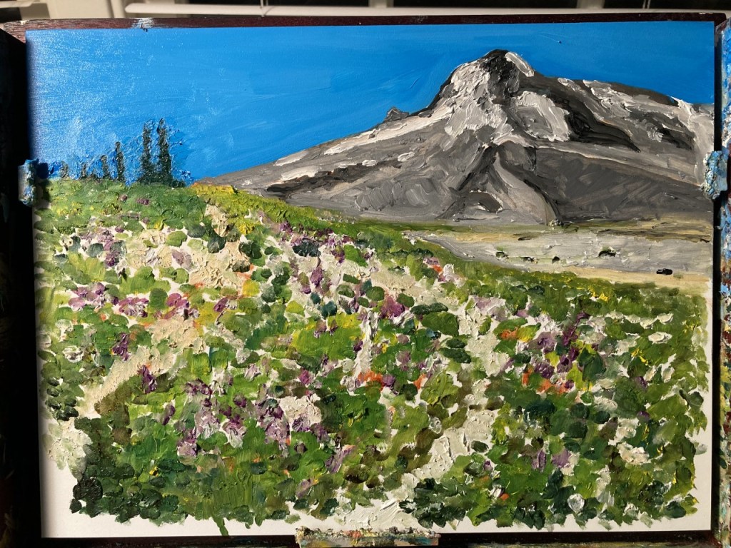 In late July 2022, I backpacked and camped at some sections of the Pacific Crest Trail (PCT) near Mt Hood in Oregon. This painting is based on a scene as you are getting close to the lodge. There was still some snow on the upper sections of Mt Hood.