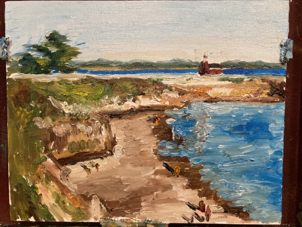 This painting was done while living in Santa Cruz in March 2023. The steep vertical wall cliffs of West Cliff/ light house area with the big wave crashing from the Pacific on the big cliffs make for dramatic views everyday!