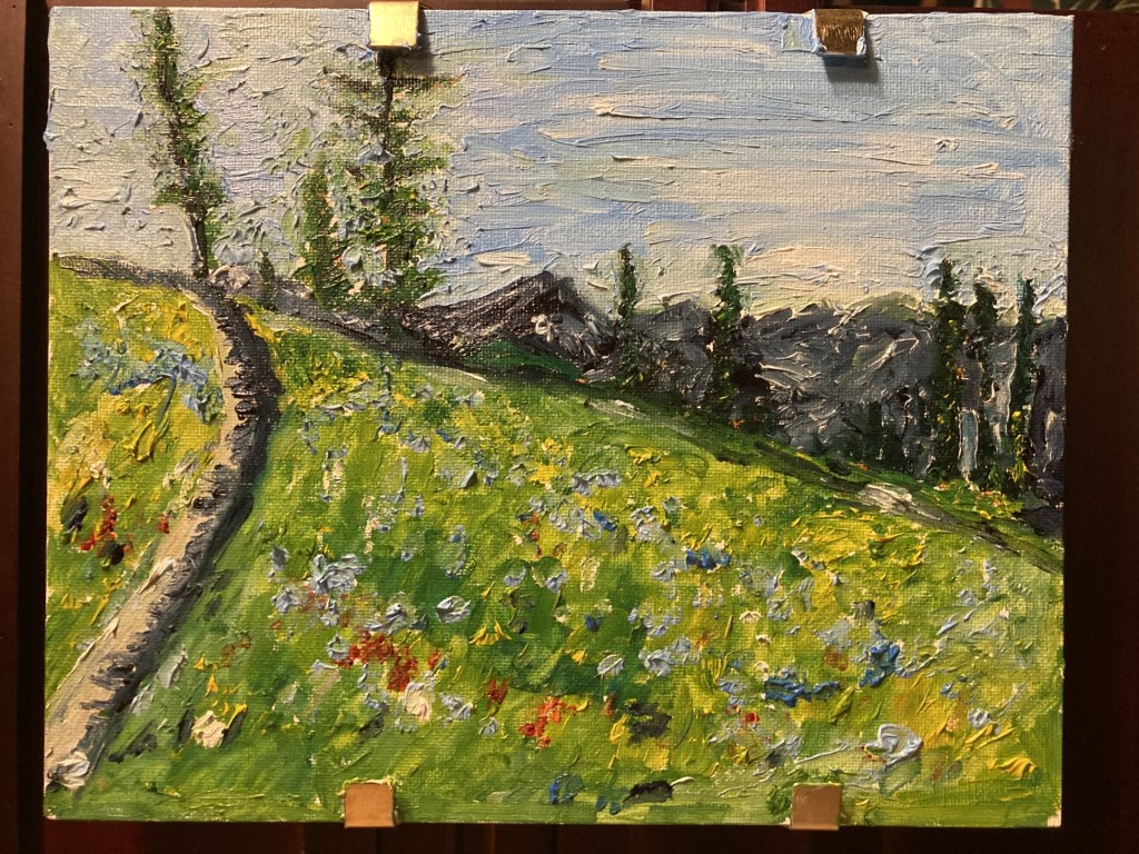 This painting is based on a PCT Trail Section just north of the Harts Pass ranger station. We hiked this section in late July while hiking the Washington State PCT trail section.
