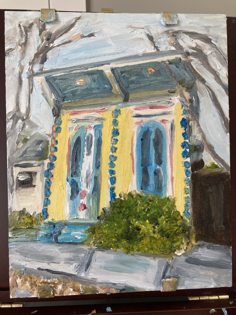 There are thousands and thousands of historic homes in New Orleans. Many have been fixed up and painted in bright colors. This painting is one bright yellow and blue house in the Bywater neighborhood of New Orleans.
