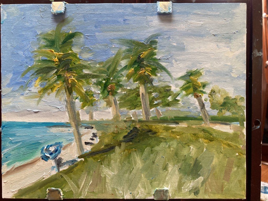 Here is another painting of Sombrero Beach on a sunny morning in February. I am starting to practice my palm trees and various shades of water color that exist as different ocean views and times of the day.