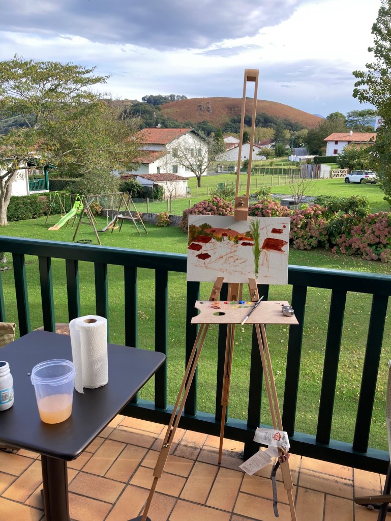We stayed in this small town in the Basque region of France. For this first painting, I decided to paint on the balcony of our hotel room to experiment with the paints. This was the view from the balcony.