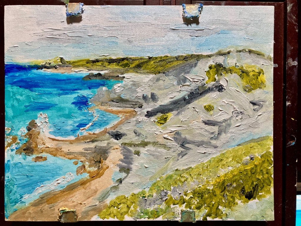 This is a painting looking from a high rock on the Atlantic looking down the rugged coast line.