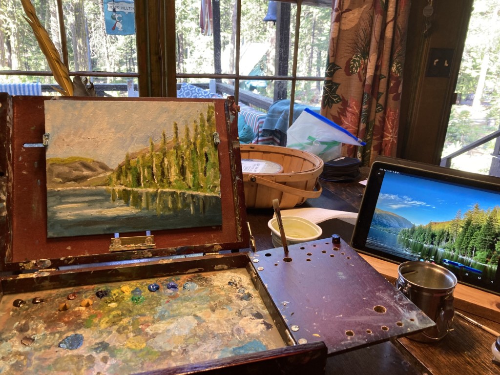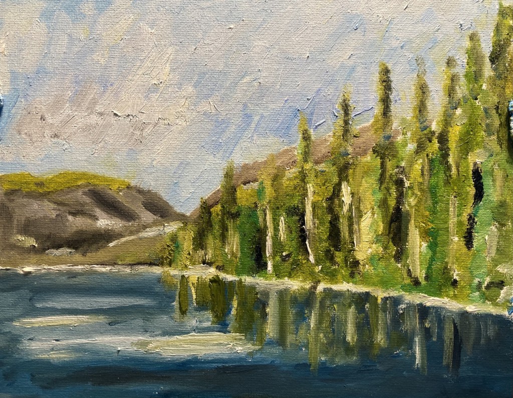 This painting is a view of Pinecrest Lake in late evening in June.