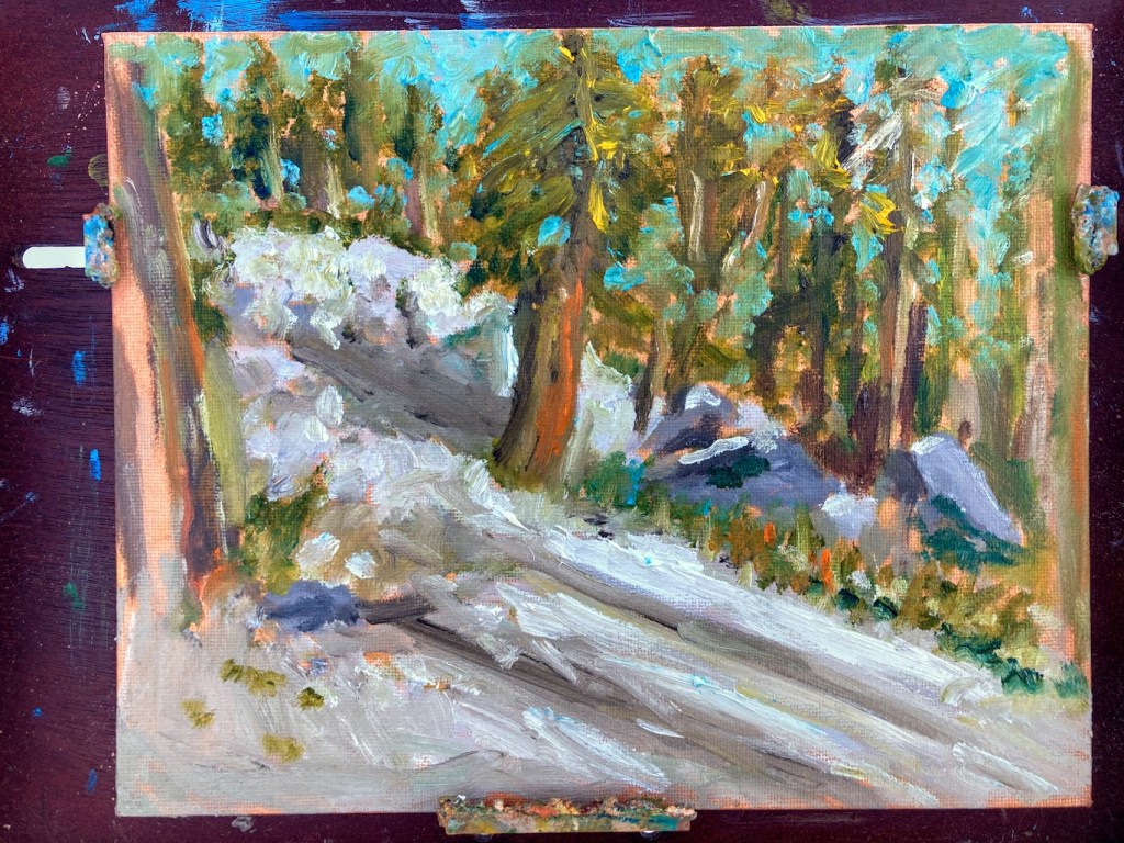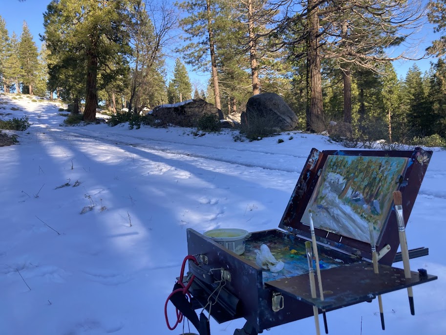 The snow has arrived in the Sierras in California so today I grabbed my painting gear and headed off to capture a snowy view with trees and rocks.