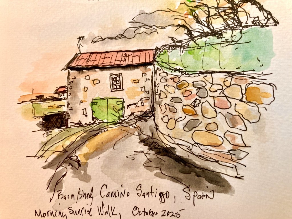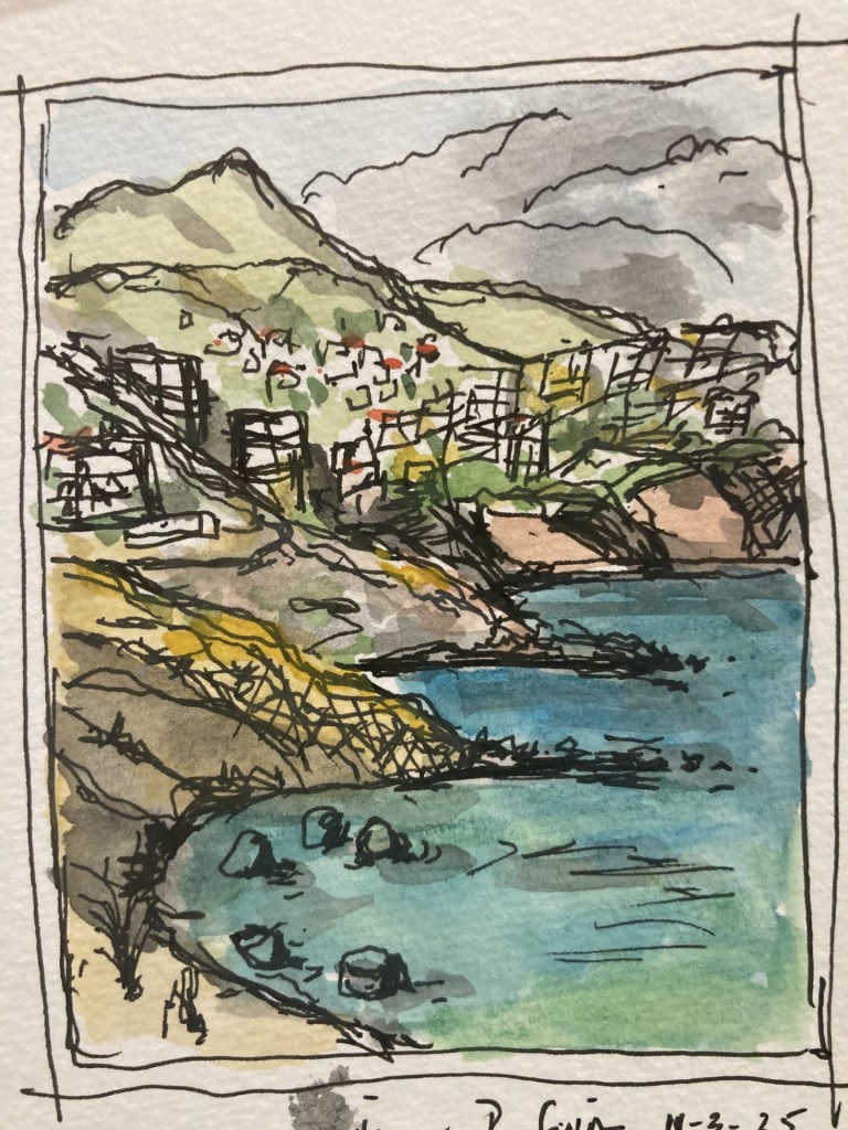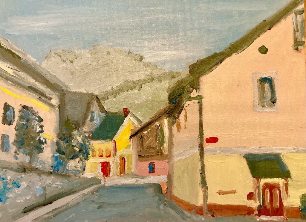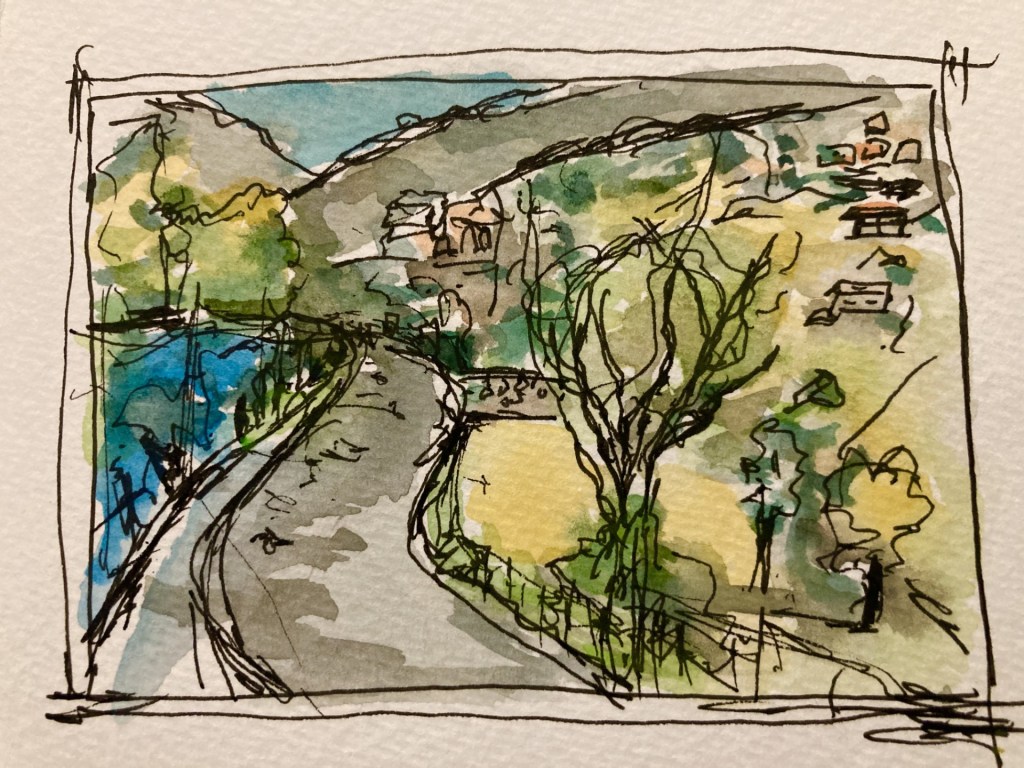 This tiny town higher in the mountains had houses and streets that were over a thousand year old. This street and the light made for an interesting sketch and painting.