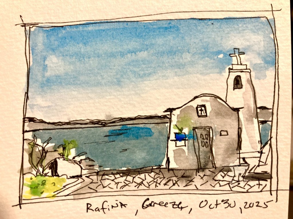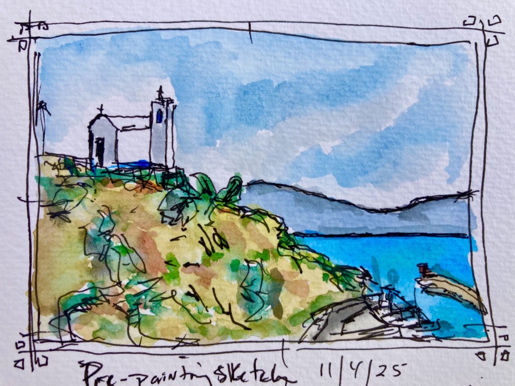 I spent about a week visiting friends in a small town outside of Athens in a town called Rafina which is on the coast. Some hills and small white churches make for some interesting painting subjects along with the beautiful blue green waters of the seas.