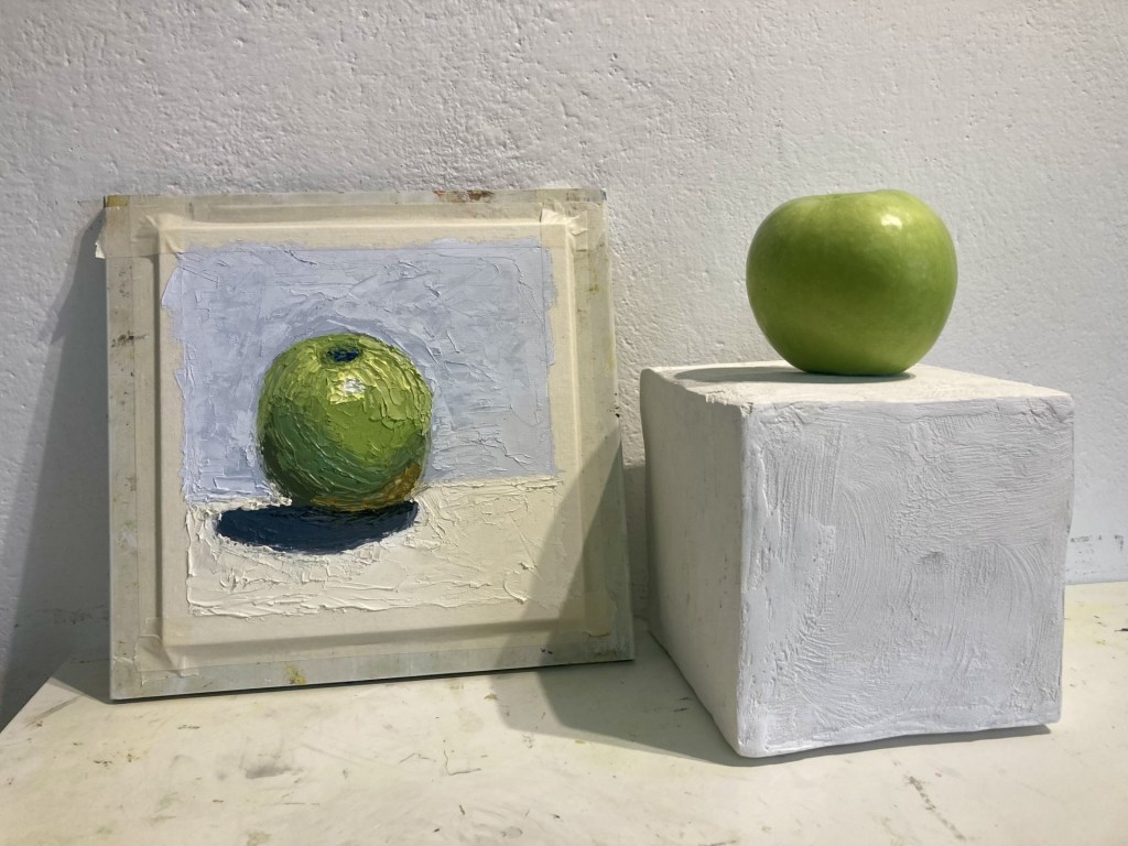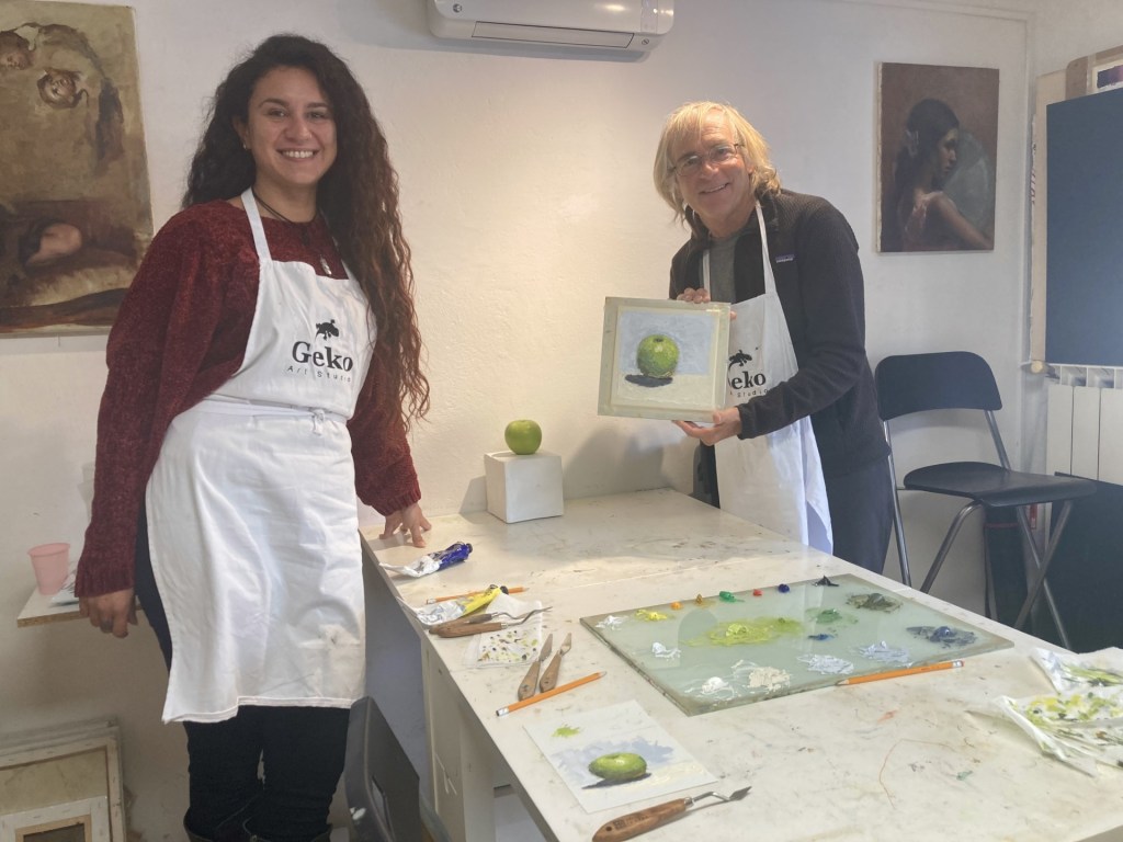 I was able to take a few painting classes at a small art school where one class focused on painting with palette knife and another class focused on various painting techniques and processes. Here are the two paintings and the instructor from Greece.