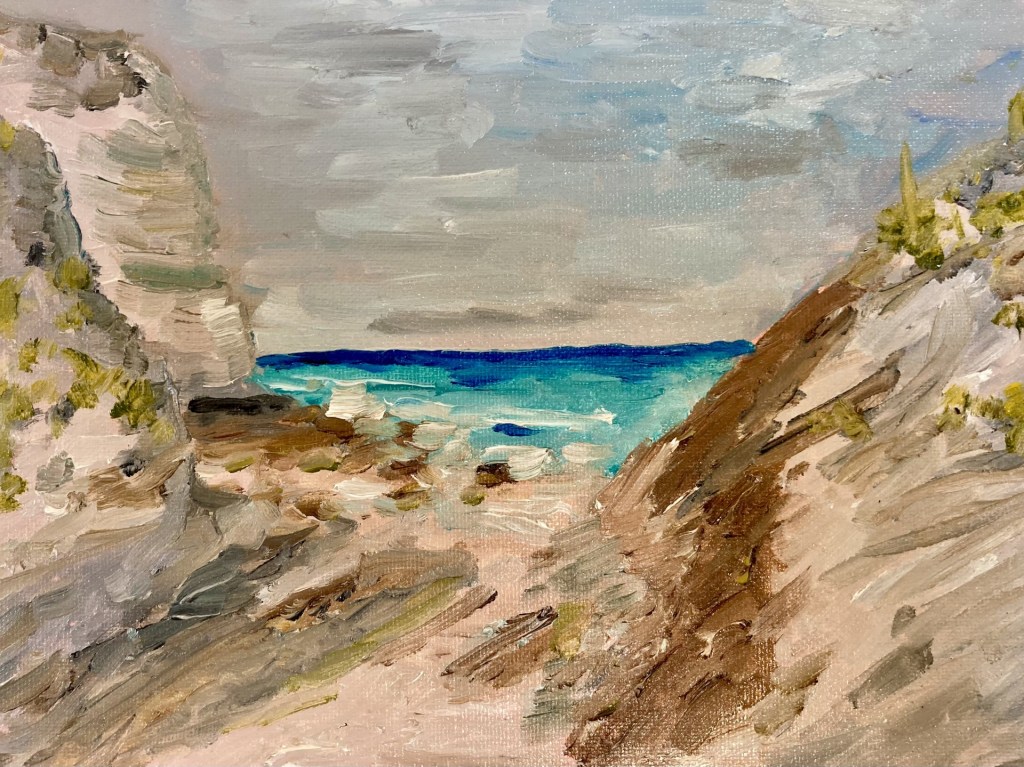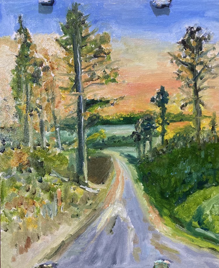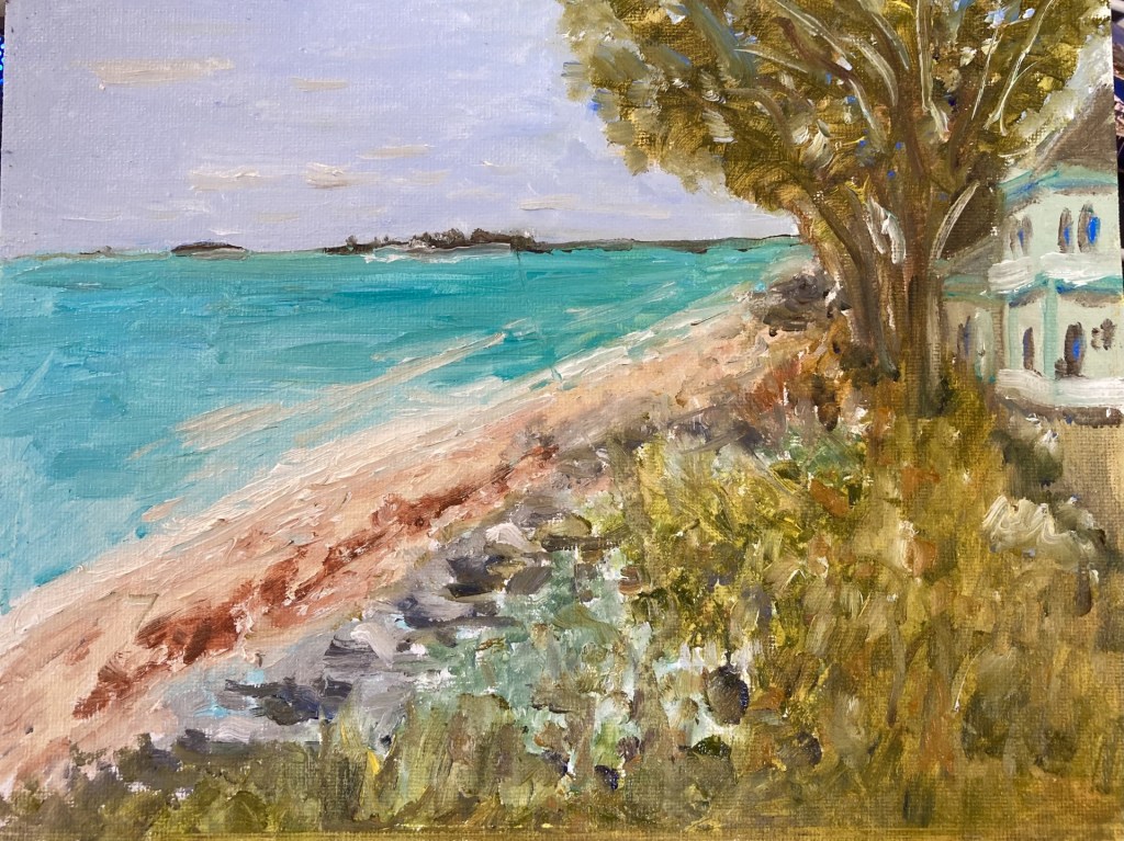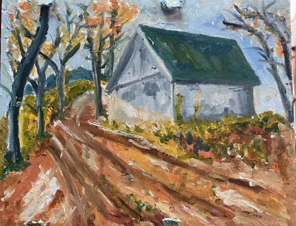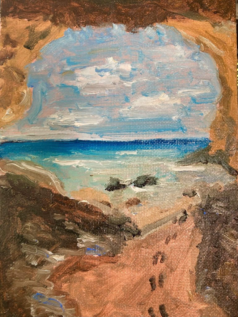 Camino Santiago Morning, Spain Feb 2026 8×10 OilSlovenia Barn, Feb 2026 – 8×10 OilBiscyane Bay Lighthouse, March 2026 – 8×10 OilCave Beach Great Harbour Cay Bahamas – March 2026 – 8×10 oilKits House and yard – Great Harbour Cay, Bahamas – March 2026Beach Cave with Footsteps – March 2026 – 8×10 Oil